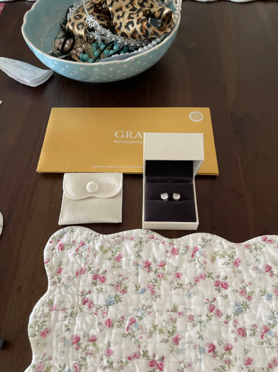 The GRA certificate (Gemological Research Association) is an authenticity report that confirms the stone’s quality, cut, and brilliance — proving it’s a real moissanite of high grade.